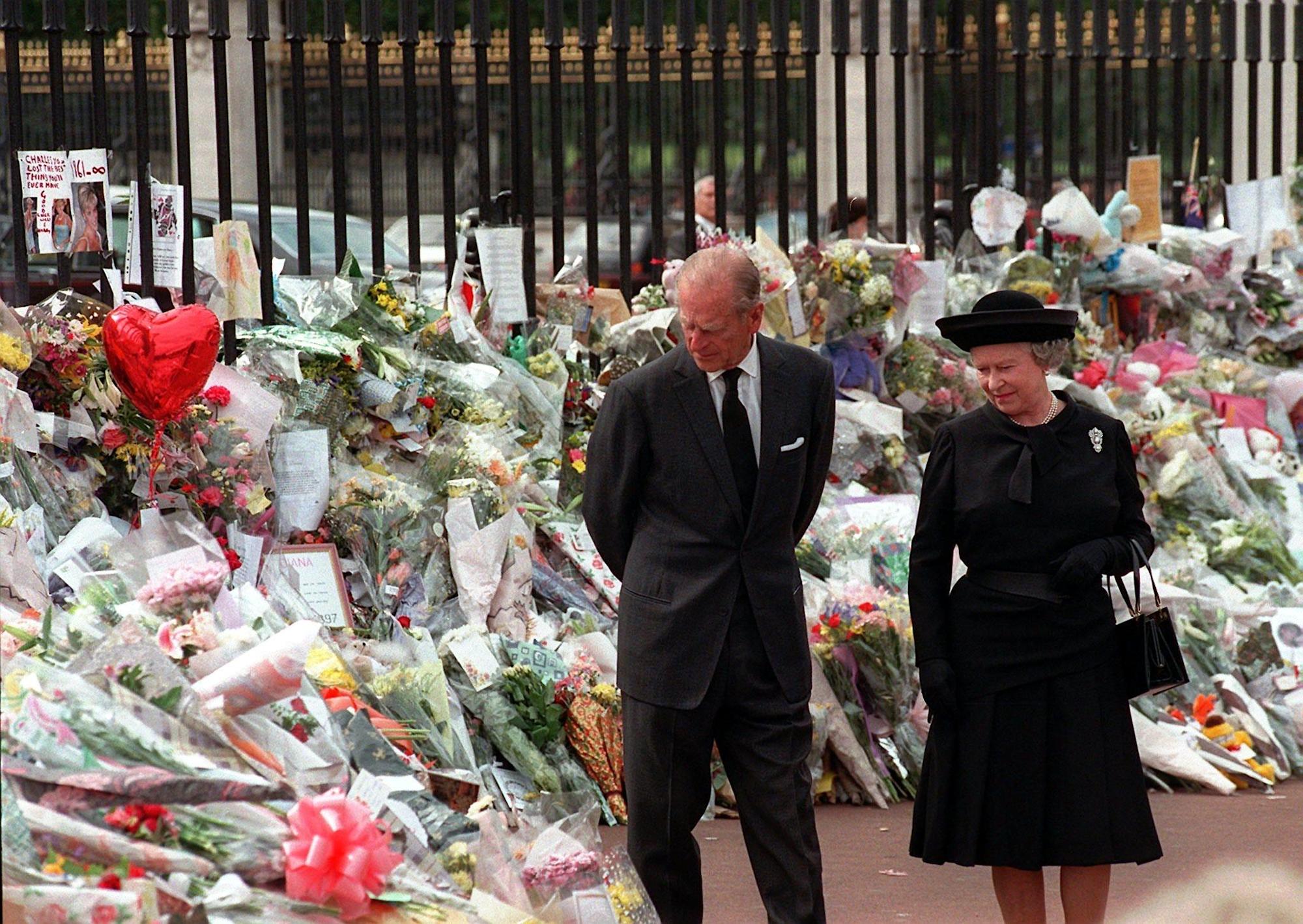 In one image, Queen Elizabeth is seen smiling up at Prince Philip, while another...